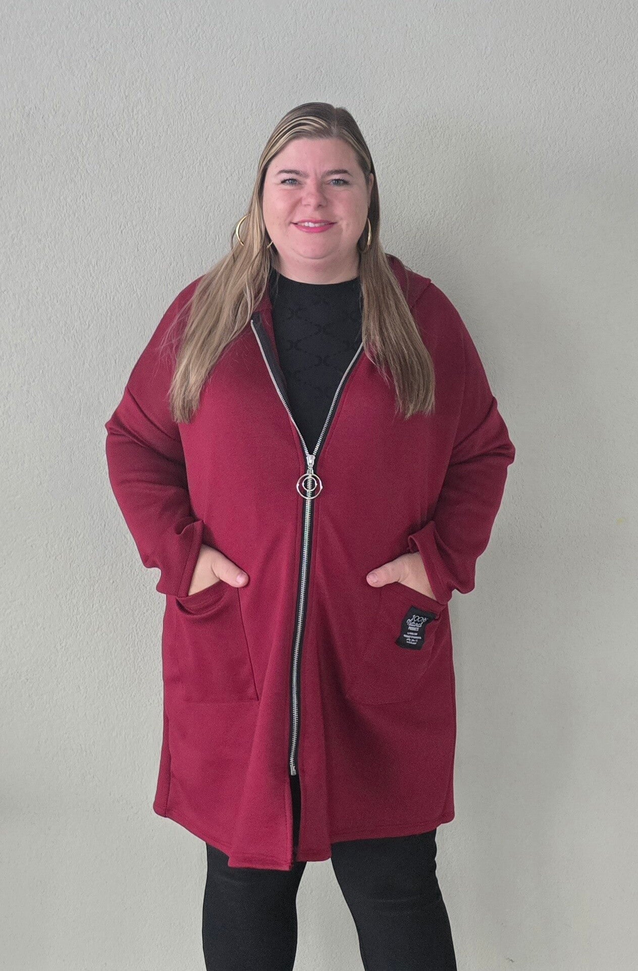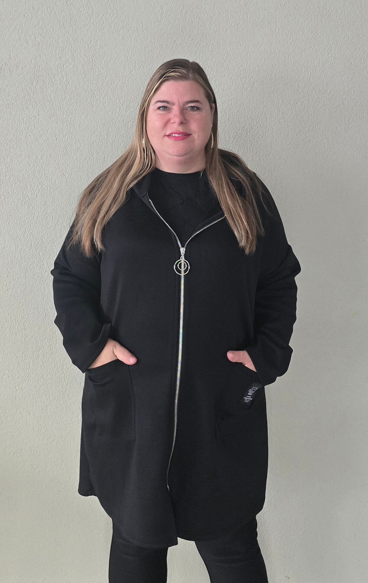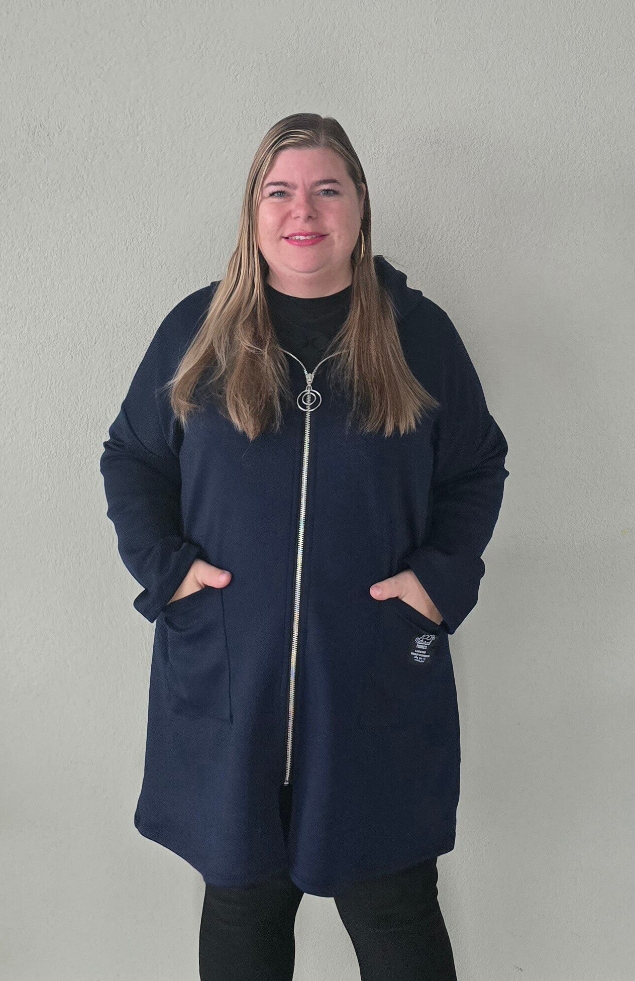 Model is 1,60 lang en draagt kleding maat 46.